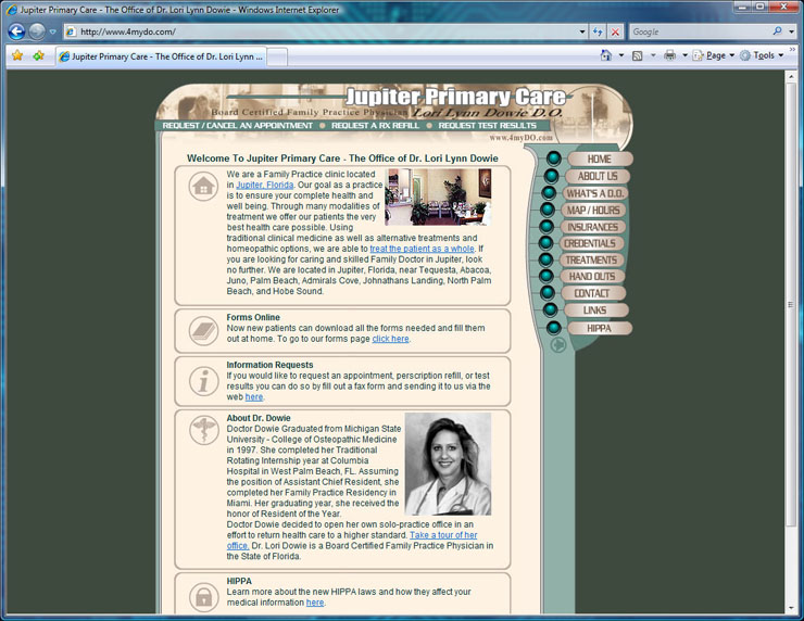 HTML/Flash website for a medical practice in Jupiter, Florida. Featuring high SEO presence, 450+ pdf library and patient form downloads.