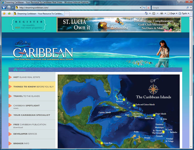 300 page website for Caribbean travel. Interactive loaction map, directory of hotels/realestate and travel information.